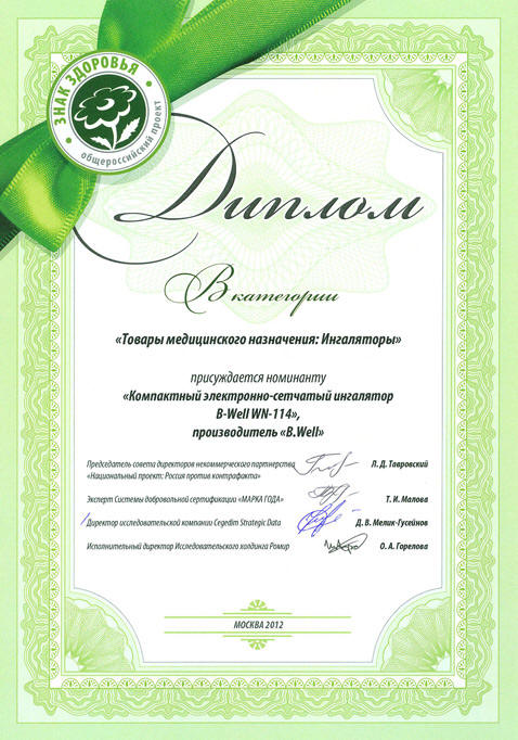 Мембранный небулайзер B.Well WN-114 отмечен дипломом «Знак здоровья». В апреле