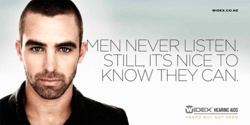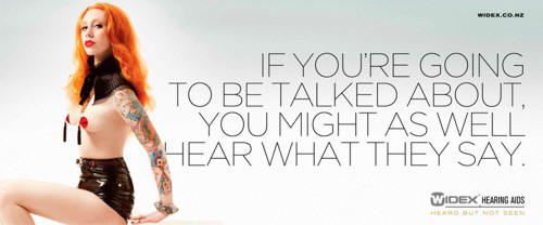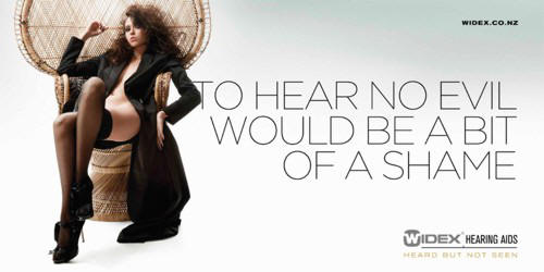 Так, в Новой Зеландии представительством Widex была запущена рекламная кампания с довольно неоднозначными принтами и слоганами. Но, надо признаться, подобная реклама мало кого оставит равнодушным. Вдобавок эта реклама как бы аккуратно намекает, что со слуховым аппаратом слабослышащий не будет ничем отличаться от человека, не испытывающего проблем со слухом.